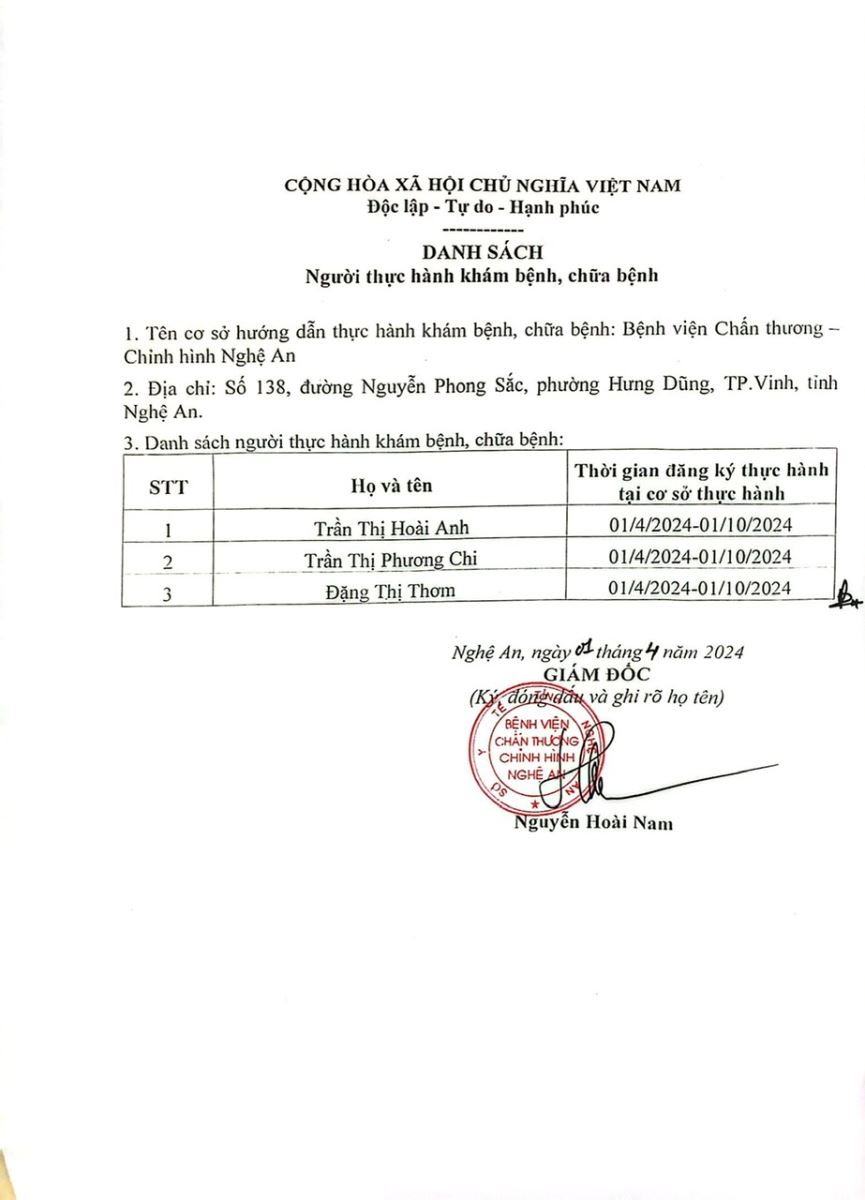 Danh sách đăng ký thực hành tại Bệnh viện Chấn thương - Chỉnh hình Nghệ An