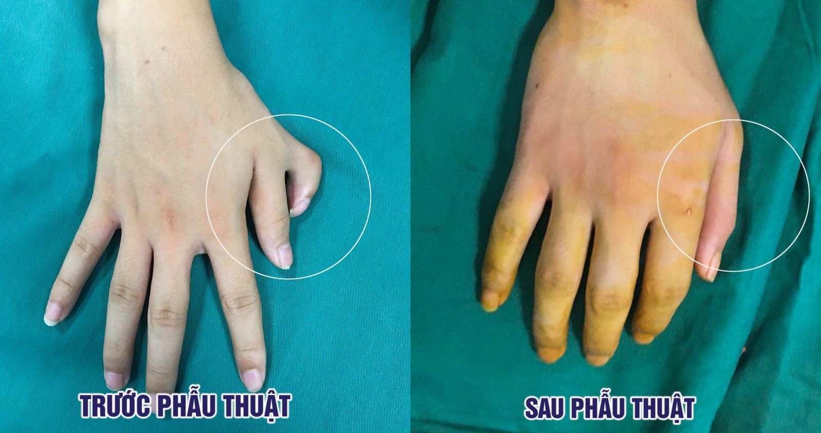Sau trục (postaxial polydactyly): ngón út sinh đôi.