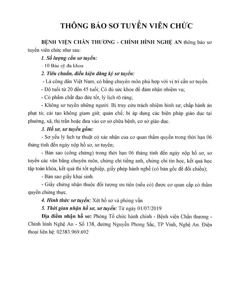 Nhằm đáp ứng nhu cầu phát triển và nâng cao chất lượng phục vụ, Bệnh viện Chấn thương Chỉnh hình Nghệ An thông báo sơ tuyển 10 Bác sĩ đa khoa.
